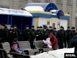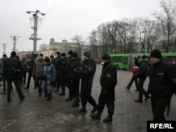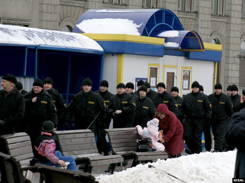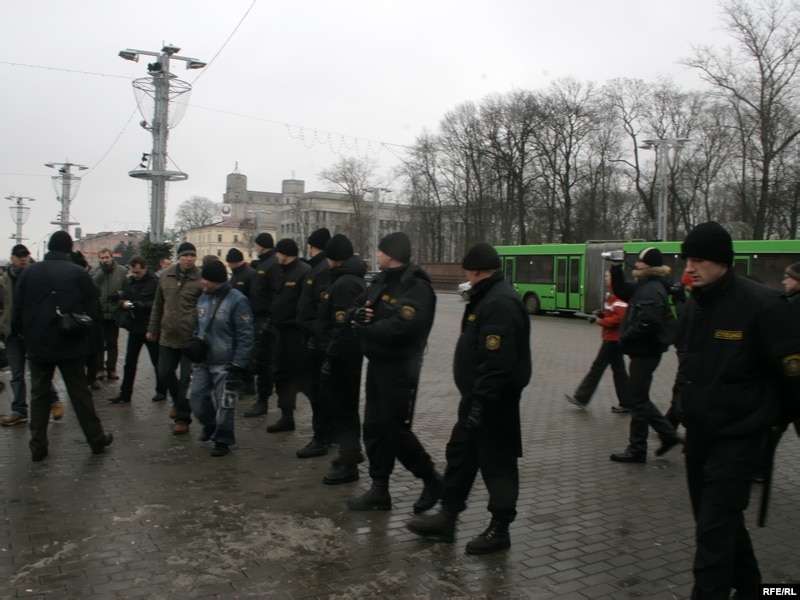 11:40 Кастрычніцкую плошчу патрулююць міліцыянты. Плошча пакуль пустая, на ёй стаіць вада -- там залівалі каток, але тэмпэратура цяпер плюсавая. На плошчы Свабоды стаіць дзясятак міліцэйскіх аўтобусаў.