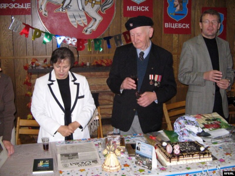 Іпатава: “Я ўбачыла яго ўпершыню на прыступках Опэрнага тэатру, калі ён выступаў на мітынгу. Гэта быў 1992 год, калі ён прыехаў у Беларусь першы раз пасьля вайны. Я, прызнацца, нават і ня думала, што ён жывы, і што ён тут. Я доўга на яго глядзела і не асьмельвалася падысьці, але ўсё ж падышла, і мы пазнаёміліся. І што было мне вельмі дорага, ён, аказваецца, ведаў маё імя, гэта значыць, ён сачыў за беларускай літаратурай на Бацькаўшчыне”.