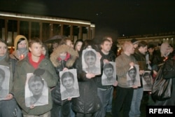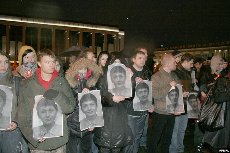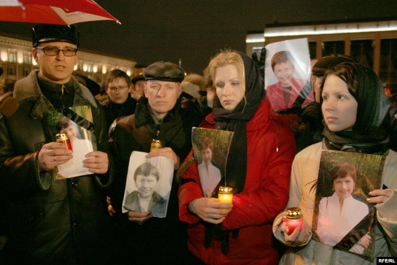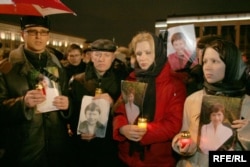 18.50 Людзі з партрэтамі Ірыны Казулінай і запаленымі сьвечкамі ідуць да Чырвонага касьцёлу.