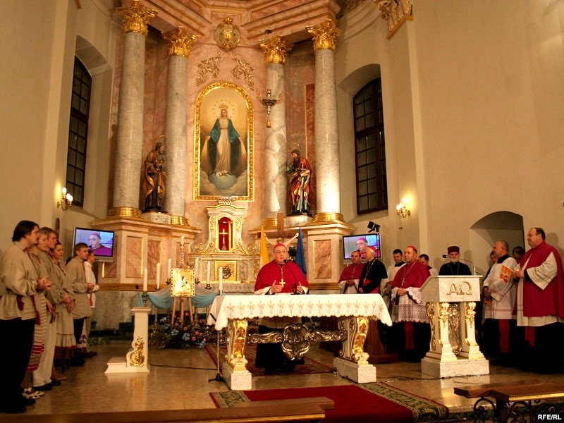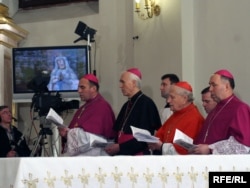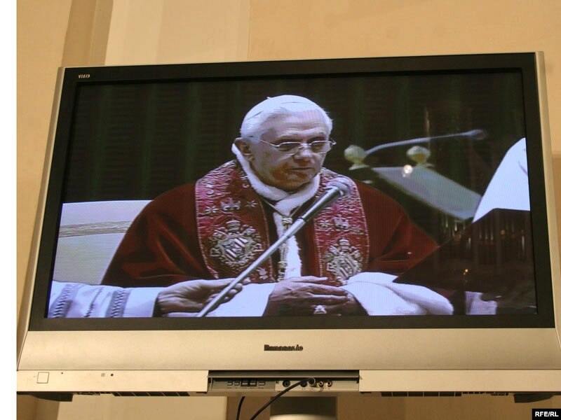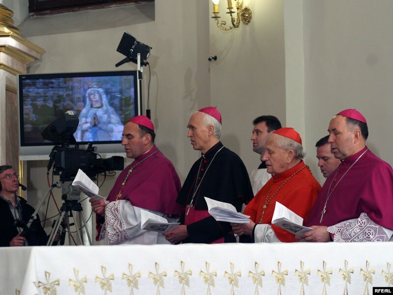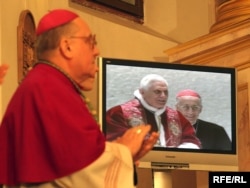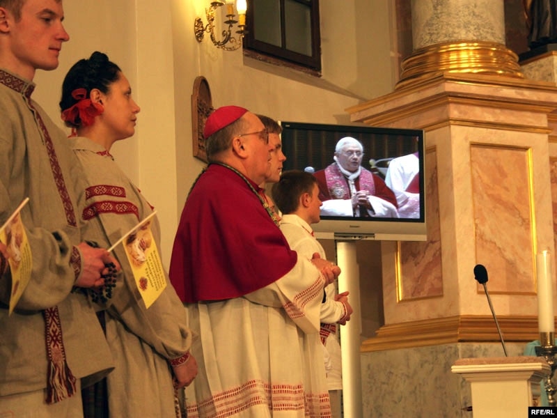 Вядучаму: “Па завяршэньні супольнай імшы, мітрапаліт Тадэвуш Кандрусевіч сказаў, што гэта быў першы віртуальны візыт у Беларусь Папы Рымскага, але ён спадзяецца і верыць, што Бэнэдыкт ХVI у сапраўднасьці ступіць на беларускую зямлю”.