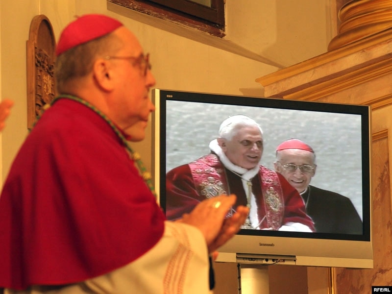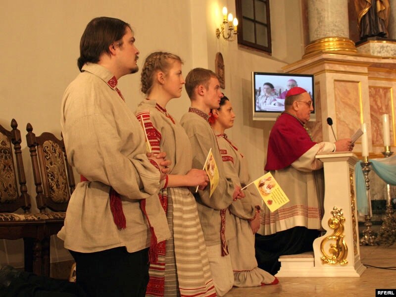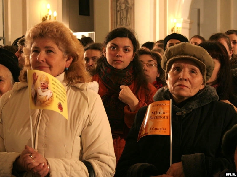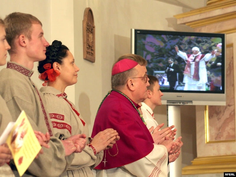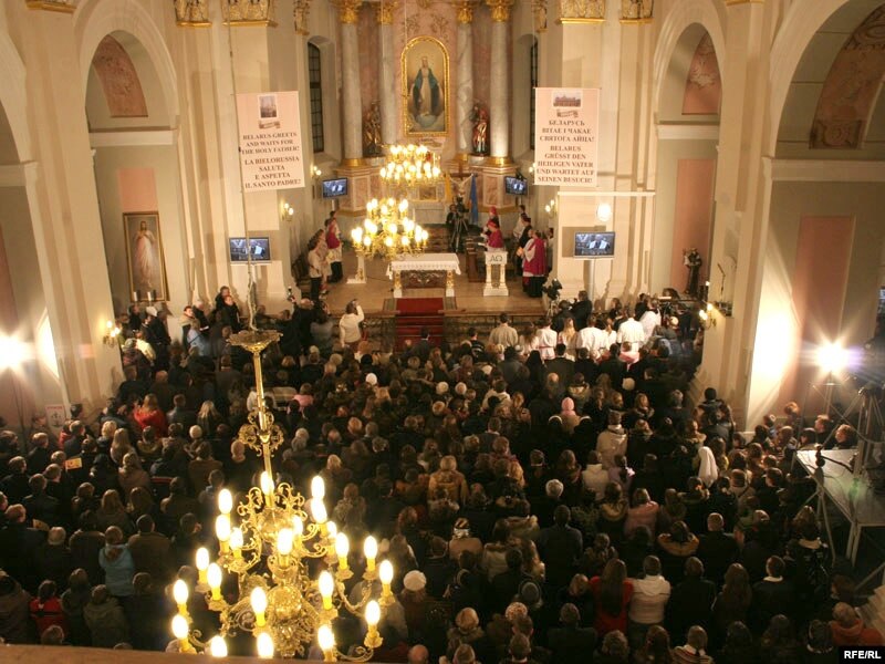 За гадзіну да тэлеўключэньня з залі Паўла VІ у Ватыкане, мітрапаліт Тадэвуш Кандрусевіч прывітаў сотні чалавек, якія сабраліся ў менскім касьцёле Панны Марыі, а таксама дзесяткі дэлегацый з розных рэгіёнаў Беларусі: