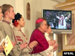 Арцыбіскуп Тадэвуш Кандрусевіч і моладзь вітаюць папу Бэнэдыкта XVI