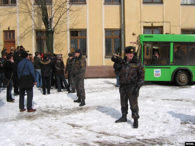 12.00 У суд Савецкага раёну Менску прывезьлі затрыманых учора ўдзельнікаў акцыі. Спэцназ міліцыі зрабіў два ланцугі, каб ня даць паплечнікам і сваякам затрыманых наблізіцца да іх. Аўтобус пад’ехаў да бакавога ўваходу ў будынак суду, і адтуль вывелі 19 затрыманых. Побач стаіць яшчэ адзін аўтобус з затрыманымі, якім міліцыянты не дазваляюць адхінуць фіранкі. Тым часам адбываюцца суды ў Маскоўскім раёне, а частку людзей, якіх трымалі ў міліцыі Савецкага раёну, адвезьлі ў суд Заводзкага раёну. Паводле непацьверджанай інфармацыі, частку людзей, якіх моцна зьбілі падчас затрыманьня, будуць судзіць у будынку суду на Акрэсьціна.