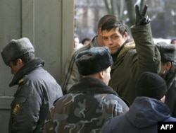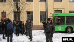 Спэцназаўцы ўтварылі жывы калідор, каб ніхто з прысутных ня мог наблізіцца да затрыманых, калі іх выводзілі з аўтобусу.