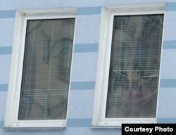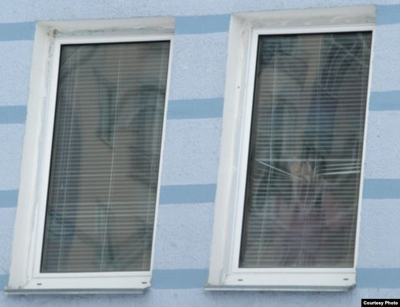 Каля будынку стаяць два мікрааўтобусы зь цёмным шклом.