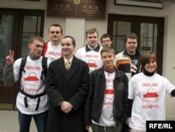 Падсудныя на ганку суду перад пачаткам працэсу. З-за маек з надпісам “Люблю Беларусь!” і вытрымкамі з Канстытуцыі іх не хацелі пускаць на працэс