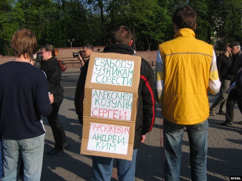 А 6-й вечара на Кастрычніцкай плошчы сабралося каля паўсотні актывістаў моладзевага дэмакратычнага руху. Сярод іх быў лідэр АГП Анатоль Лябедзька, а таксама прадстаўнікі прадпрымальніцкага руху. Яны прыйшлі з партрэтамі Андрэя Кіма, Зьмітра Лісяенкі, Сяргея Парсюкевіча. Акцыю прысьвяцілі справе, якую назвалі "справай 14-ці". Яшчэ трох актывістаў будуць судзіць па гэтай справе 23 траўня. Яны таксама прыйшлі на плошчу і выказалі ўсім падзяку.