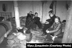 На фота №48 сфатаграфаваны нутраны выгляд палаткі, у якой дзяжурылі маладыя людзі. Тут жа зьнятыя і самы энтузіясты.
