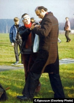 Заканчваем гэтую сэрыю архіўным ужо здымкам С.Курыцына з 1989 года, на якім адлюстраваны рэдактар гэтай нашай тэмы (Ваш слуга) разам з маладзенькай дачкой мастака Віктара Маркаўца. Гэта 29 кастрычніка, Дзяды, ля Ўсходніх могілак, рыхтуемся (прышпільваем адзнакі Дзядоў) да шэсьця і нясеньня Крыжа Пакуты ў Курапаты.