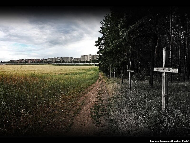 Наступны здымак З.Крываноса (назавём яго ўмоўна – “Горад і Курапаты”) добра адлюстроўвае ўскраіну Курапатаў з боку поля ў бок Калодзішчаў і гораду, які ў далечыні. Гэты здымак зьняты ў чорна-белым бачаньні, і колер тут непатрэбны (стварае непрыемнае ўражаньне і развальвае карціну). Танальная і рытмічная дынаміка, пачынаючы ад крыжа справа, вядзе пэрспэктыву па дыяганалі ўлева па цэнтру за межы кадра. Тым часам левая палова фотакарціны ўсяроўна выглядае пуставатай.