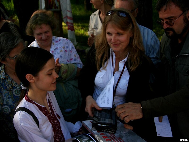 Каардынатарка фотаконкурсу Ганна Соўсь ганаруе ўдзельніцу конкурсу Надзею кнігай Зянона Пазьняка "Развагі" і прыёмнікам і флэш-картай ад Радыё Свабода