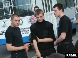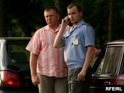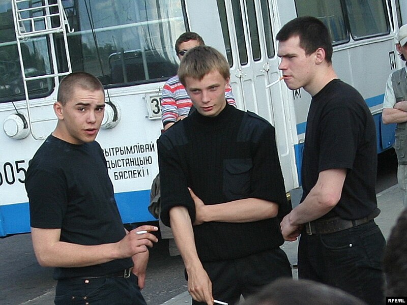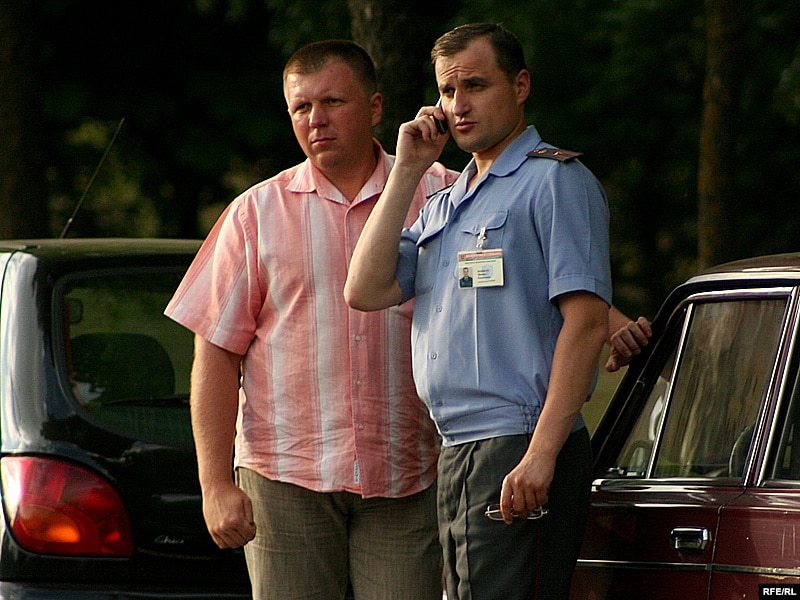 На пляцоўцы стаялі “аўтазак” і аўтобус са спэцназаўцамі. Некалькі маладых людзей, апранутых у чорныя майкі і штаны, запраўленымі ў боты, хадзілі вакол натоўпу. Журналісты заўважылі, што яны некалькі разоў падыходзілі і садзіліся ў аўтамабіль “Жыгулі”, за рулём якога знаходзіўся міліцыянт.