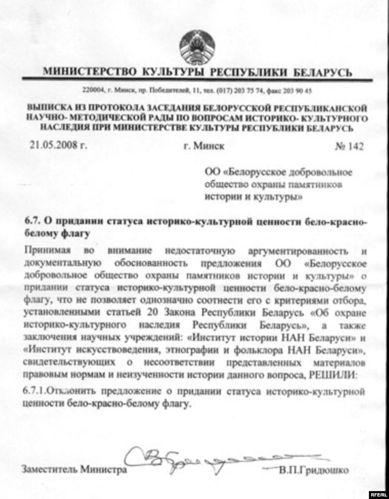 Скобла: “Намесьнік міністра культуры Грыдзюшка, перш чым “адхіліць прапанову аб наданьні статусу гісторыка-культурнай каштоўнасьці бел-чырвона-беламу сьцягу”, спасылаецца на адпаведныя высновы, зробленыя ў акадэмічным Інстытуце мастацтвазнаўства, этнаграфіі й фальклёру. Што маецца на ўвазе?”