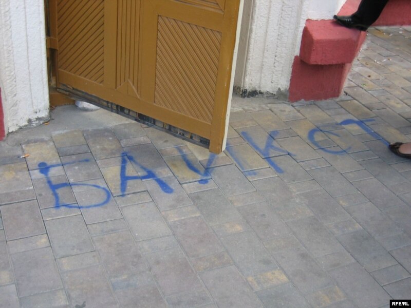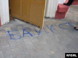 На фота: надпіс "Байкот" перад уваходам у штаб-кватэру БНФ