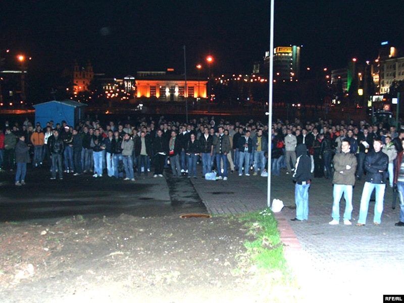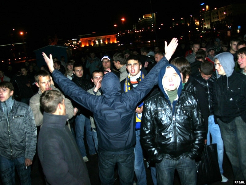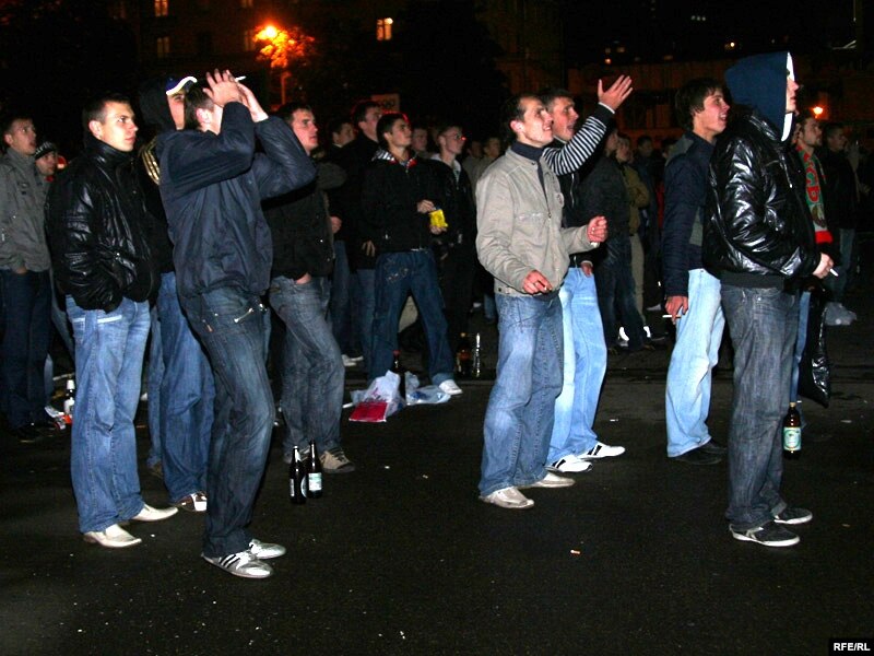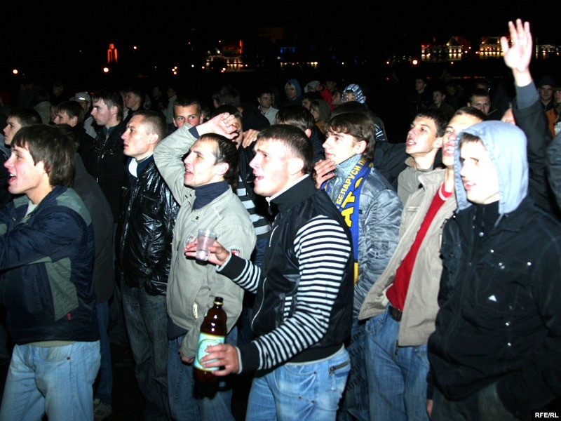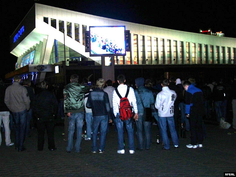 22.05 Неўзабаве ўсе былі там. Чуваць воклічы, тут каля тысячы чалавек. Людзей проста не папярэдзілі, што трансьляцыі на Кастрычніцкай плошчы ня будзе. Заўзятарыі прыйшлі на плошчу, бо падчас эўрапейскага чэмпіянату ўсе глядзелі трансьляцыі менавіта на Кастрычніцкай плошчы. Пляцоўка каля Палацу спорту агароджаная, але туды прапускаюць людзей, стаіць міліцэйскі ўазік. Няма ніякіх сьцягоў. Людзі заўзеюць, бурна рэагуюць.