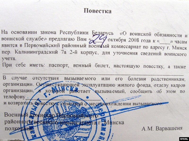 Апошнім часам у розных рэгіёнах Беларусі мужчын прызыўнога ўзросту масава выклікаюць у ваенкаматы позвамі, у якіх пазначана, што гэта робіцца, каб удакладніць зьвесткі для вайсковага ўліку. Насамрэч жа вайскоўцы адразу прапануюць здаць адбіткі пальцаў і сьліну.