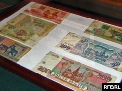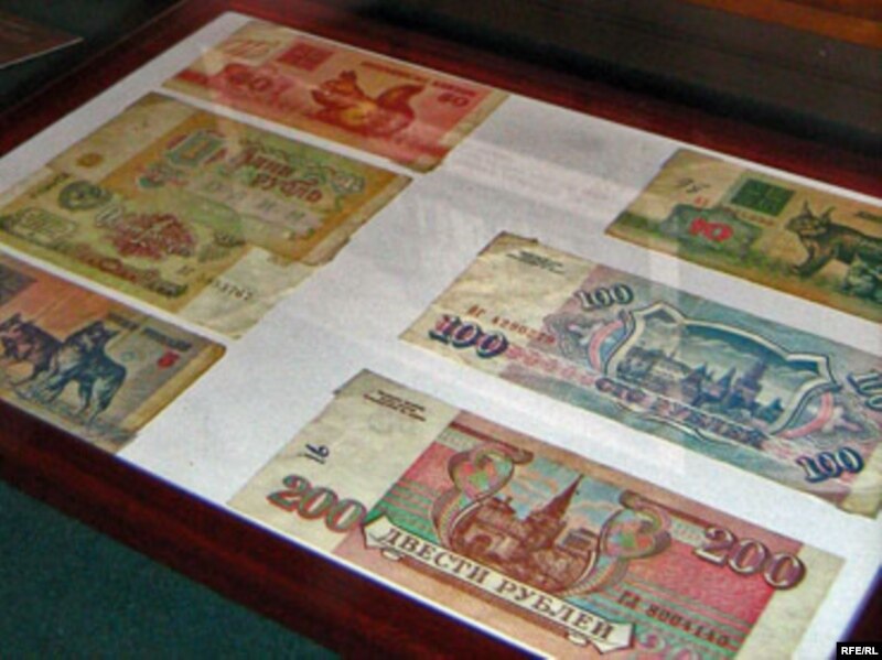 Беларускія банкноты, якія абарачаліся напачатку 90-х гадоў, чамусьці зьмешчаныя на выставе ў адной рамцы з расейскімі — 100-рублёвай і 200-рублёвай купюрамі.