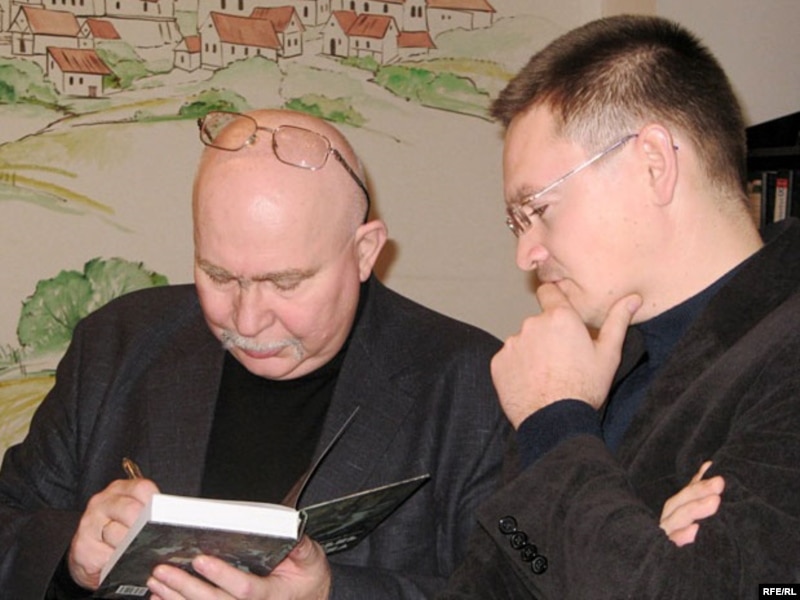 Маскоўскі пісьменьнік падпісвае сваю кнігу чытачу, справа — Алесь Пашкевіч