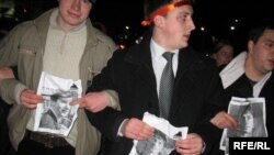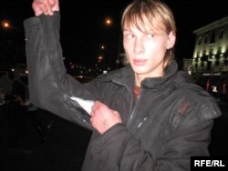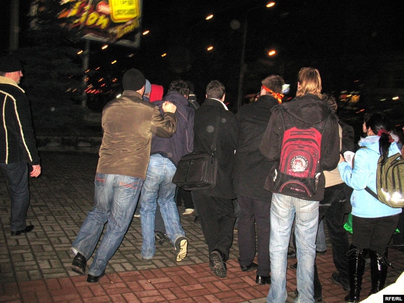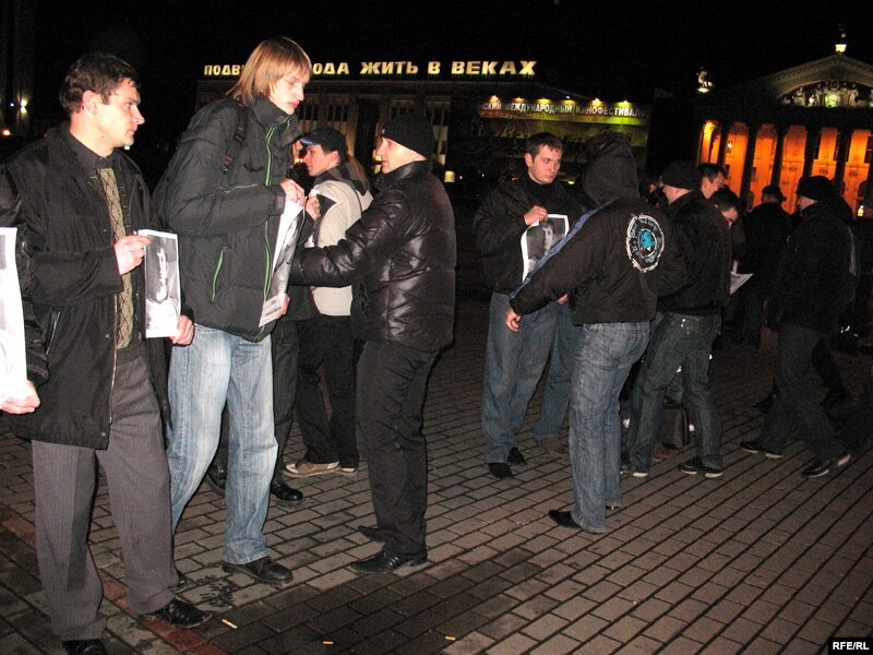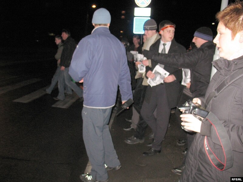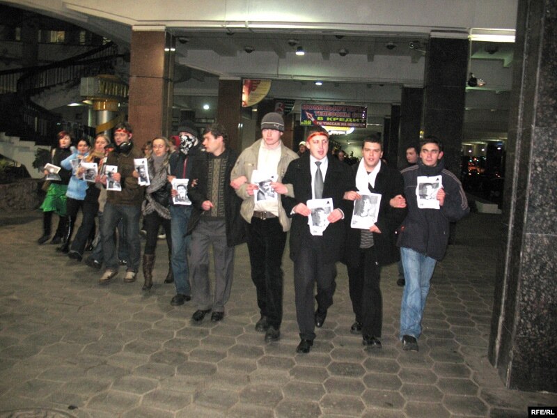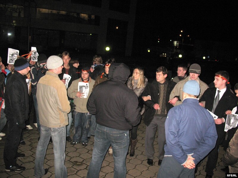 Каля 30-ці сяброў моладзевага руху “Маладая Беларусь” сабраліся а 18-й гадзіне на Кастрычніцкай плошчы. Яны ўтварылі ланцуг і разгарнулі партрэты Аляксандра Баразенкі, а таксама зьніклых апазыцыянэраў Віктара Ганчара, Анатоля Красоўскага і Юр’я Захаранкі. Удзельнікі акцыі таксама трымалі ў руках запаленыя зьнічы. Як толькі ўдзельнікі акцыі пачалі скандаваць “Свабоду Баразенку!”, міліцыянты ў цывільным пачалі выціскаць іх з плошчы. Пры гэтым яны білі дэманстрантаў, адбіралі і рвалі партрэты, разьбівалі аб асфальт зьнічы.