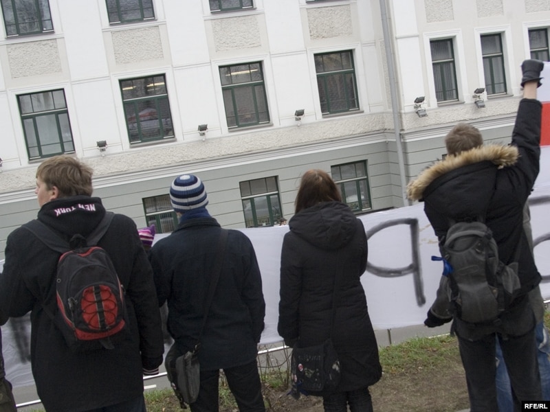 11:50 Каля 15 чалавек, паплечнікаў Аляксандра Баразенкі праводзяць пікет з другога боку праезжай часткі, па вуліцы Кірава, куды выходзяць вокны суду. Яны трымаюць расьцяжку “Свабоду Баразенку” і бел-чырвона-белы сьцяг. Актывісты няспынна крычаць лёзунгі -- “Свабоду палітвязьням”, “Жыве Беларусь”, “Уладу –народу, моладзі – свабоду”. “Рэжым адстой, Алесь –мы з табой”