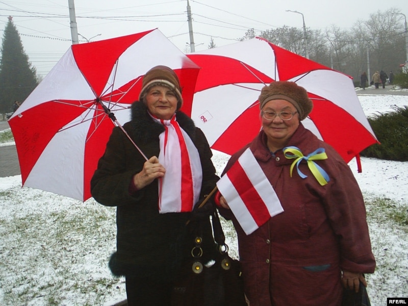 Прыкладна праз паўгадзіны да іх пад’ехаў начальнік міліцыі грамадзкай бясьпекі Кастрычніцкага раёну маёр Аляксандар Каліноўскі. Ён загадаў пенсіянэркам пакінуць плошчу пад пагрозай затрыманьня і грашовага штрафу за правядзеньне несанкцыянаванай акцыі з выкарыстаньнем забароненай сымболікі. Пэнсіянэркам, якіх ужо ня раз судзілі за падобнага кшталту грамадзянскую актыўнасьць, давялося пакінуць плошчу. Але да бліжэйшага аўтобуснага прыпынку яны дэманстратыўна прайшлі пад “апазыцыйнымі” парасонамі.