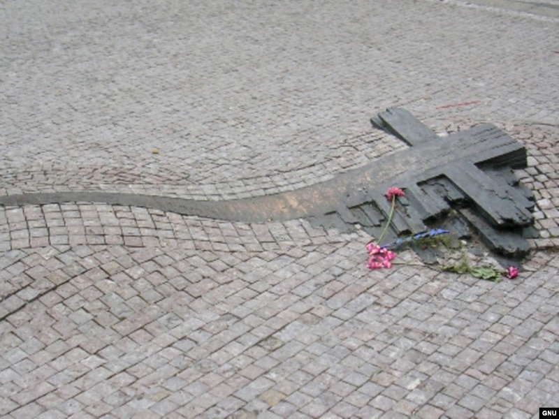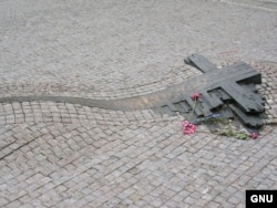 Пэнсіянэрка Яна – адна з тых, што сёньня паклалі кветкі да ўмураванага ў ходнік крыжа ля Нацыянальнага музэю ў Празе, на месцы, дзе ўпаў палаючы Палах.