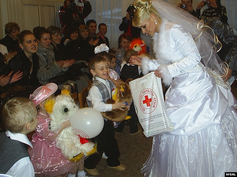 Але бадай што самую незвычайную акцыю да дня закаханых падрыхтавала віцебская грамадзкая арганізацыя “Чырвонага крыжа” разам з гарадзкім аддзелам ЗАГСу. Яны прапанавалі ўсім парам, якія сёньня бралі шлюб, зрабіць незвычайны падарунак дзіцячаму дому. Дзеля гэтага госьці маладых дарылі ім ня кветкі, як зазвычай прынята, а мяккія цацкі.