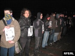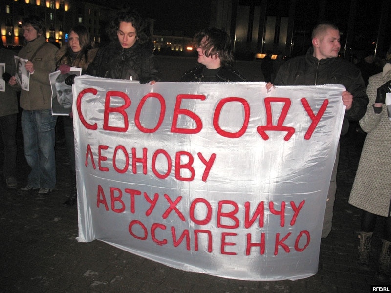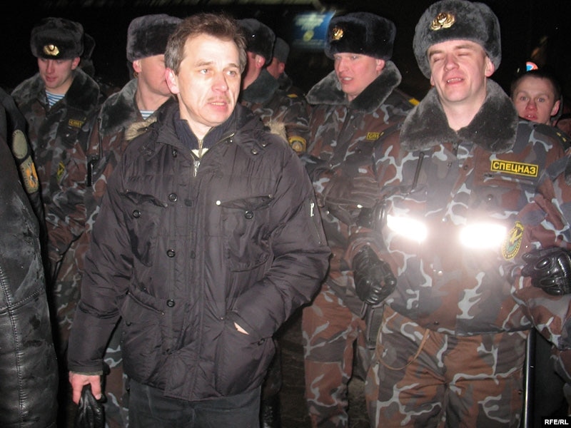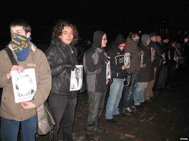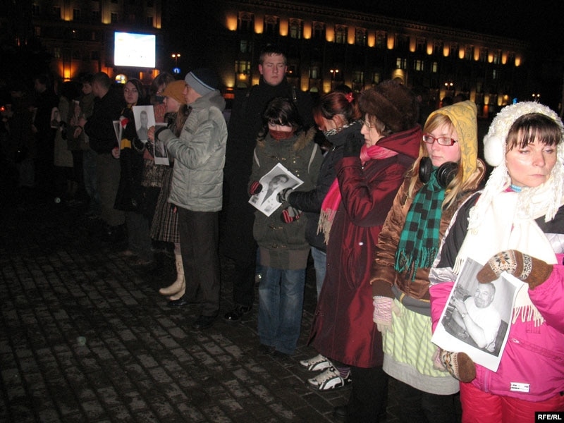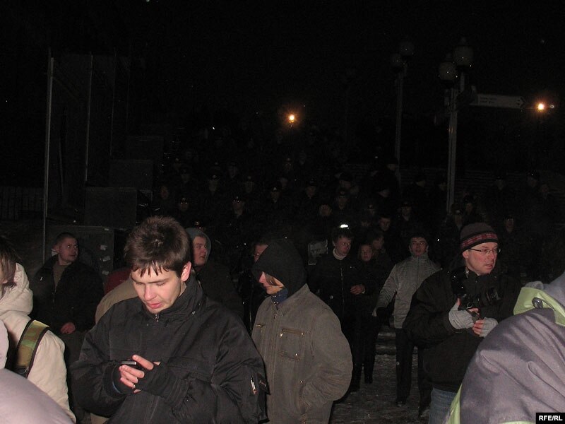 Празь некалькі хвілінаў пасьля таго як актывісты моладзевага руху сталі ў ланцуг салідарнасьцямі з новымі палітвязьнямі на Кастрычніцкай плошчы, іх абкружылі спэцназаўцы й пачалі адціскаць з плошчы.