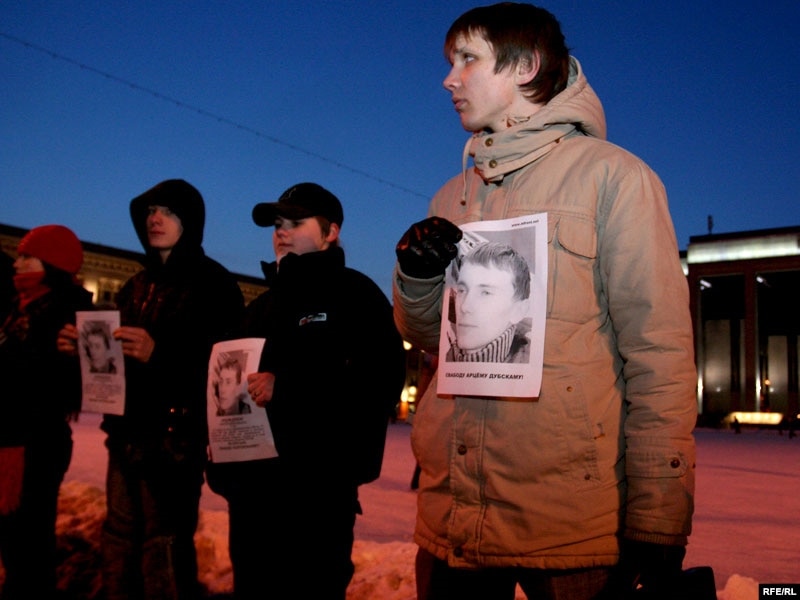 На Кастрычніцкай плошчы дзевяць актывістаў незарэгістраванай арганізацыі “Малады фронт” правялі пікет салідарнасьці з Арцёмам Дубскім, адным зь фігурантаў “справы 14-ці”, заведзенай на актыўных удзельнікаў акцыяў пратэсту прадпрымальнікаў у студзені 2008 году.