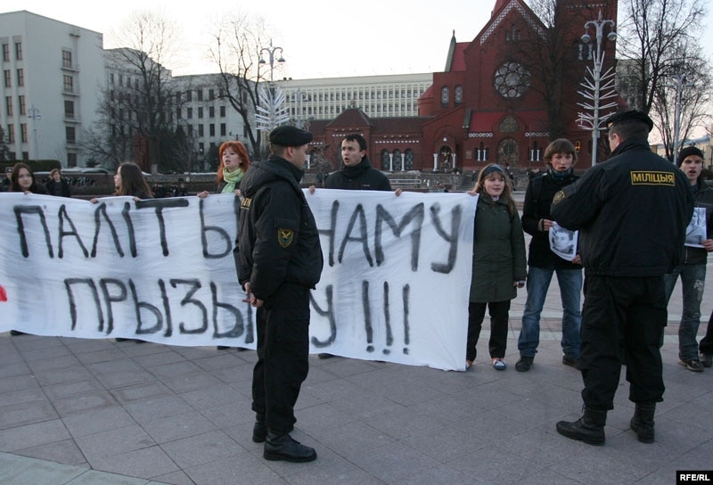 Усяго іх каля 30 чалавек. Да іх адразу падбегла кіраўніцтва міліцыі Ленінскага раёну і байцы спэцназу. Моладзь трымала вялікую расьцяжку "Не палітычнаму прызыву" Такім чынам яны выказваюцца супраць дзеяньняў вайскоўцаў, якія пад кіраўніцтвам людзей у цывільным праз ваенкаматызабралі ў войска некаторых моладзевых актывістаў.
