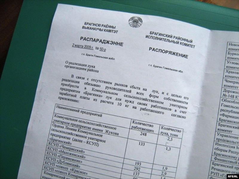 У афіцыйным распараджэньні Брагінскага райвыканкаму № 50-р сказана: “У сувязі з адсутнасьцю рынкаў збыту на цыбулю і з мэтай яе рэалізацыі абавязваю кіраўнікоў усіх формаў уласнасьці набыць у камунальным сельскагаспадарчым прадпрыемстве “Брагінка” цыбулю для патрэбаў сваіх працаўнікоў у кошт заробку з разьліку 10 кіляграмаў на працаўніка”.