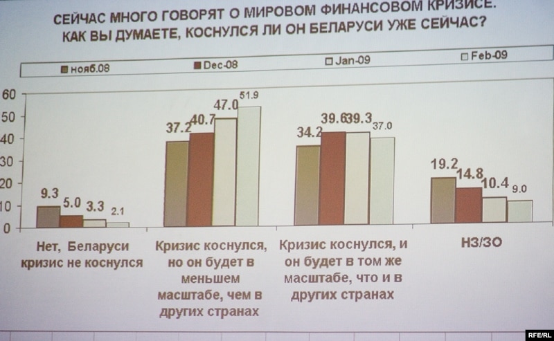 Спадарыня Яфімава адзначыла: лябараторыя пачала сваё дасьледаваньне ў лістападзе мінулага году. І таму сёньня ўжо можна казаць пра пэўную дынаміку зьмены грамадзкай думкі. Калі ў лістападзе 9% беларусаў лічылі, што крызіс абмінуў краіну, то ў лютым колькасьць аптымістаў скарацілася да 2%.