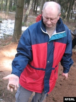 Археоляг Мікола Крывальцэвіч паказвае знойдзеную бутэлечку зь лекамі, якія часта трапляліся і пры эксгумацыі магіл у Курапацкім лесе
