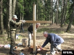 Ільля Копыль прымацоўвае шыльдачку на крыжы па сваім дзядзьку ў Курапацкім лесе