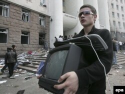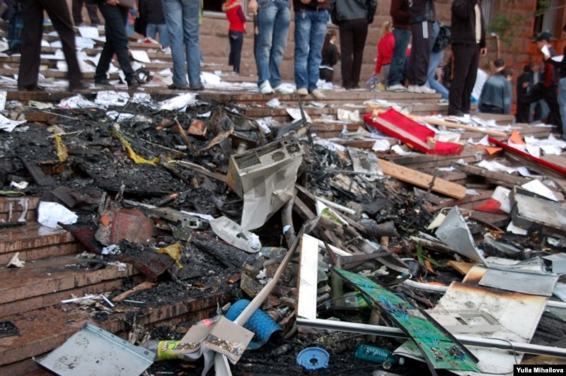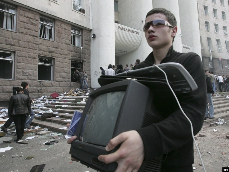 Гэтыя будынкі ўчора былі захопленыя і разрабаваныя дэманстрантамі, якія пратэставалі супраць абвешчанай перамогі на парлямэнцкіх выбарах кіроўнай Камуністычнай партыі Малдовы.