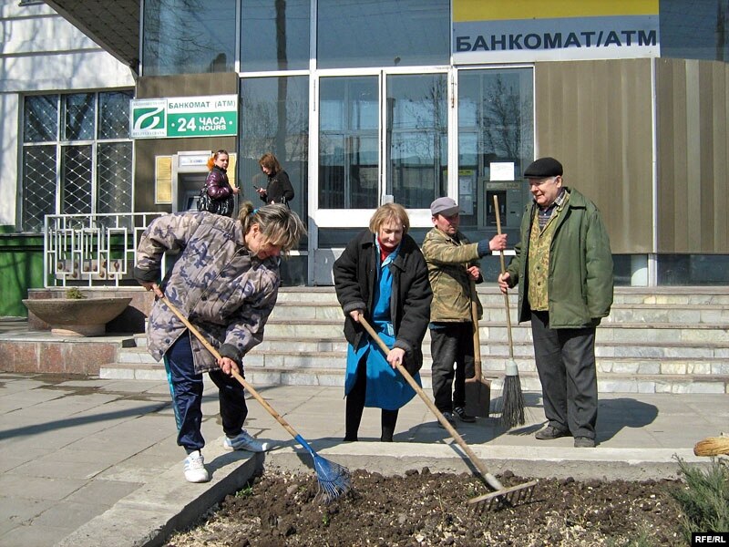 На суботнік выходзілі сёньня дэманстраваць, так бы мовіць, “вялікі пачын” нават тыя прадпрыемствы, якія працуюць чатыры дні на тыдзень. Адно зь іх — завод пускавых рухавікоў імя Панамарэнкі. Прыбіралі сквэрык, што прылягае да прахадной, пад музыку, якая разьлівалася наўкола з узмацняльнікаў гуку.