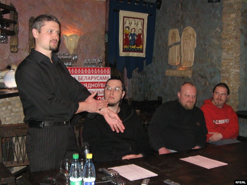 Прэс-канфэрэнцыя арганізатараў «Дударскага фэсту», які сёлета адбудзецца 24, 27 і 28 красавіка: Зьміцер Сасноўскі, Васіль Верабейчыкаў, Алег Клімчанка, Андрэй Апановіч