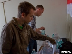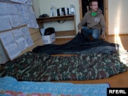 На падлозе паклалі спальнікі, на стале -- бутэлькі з вадой.