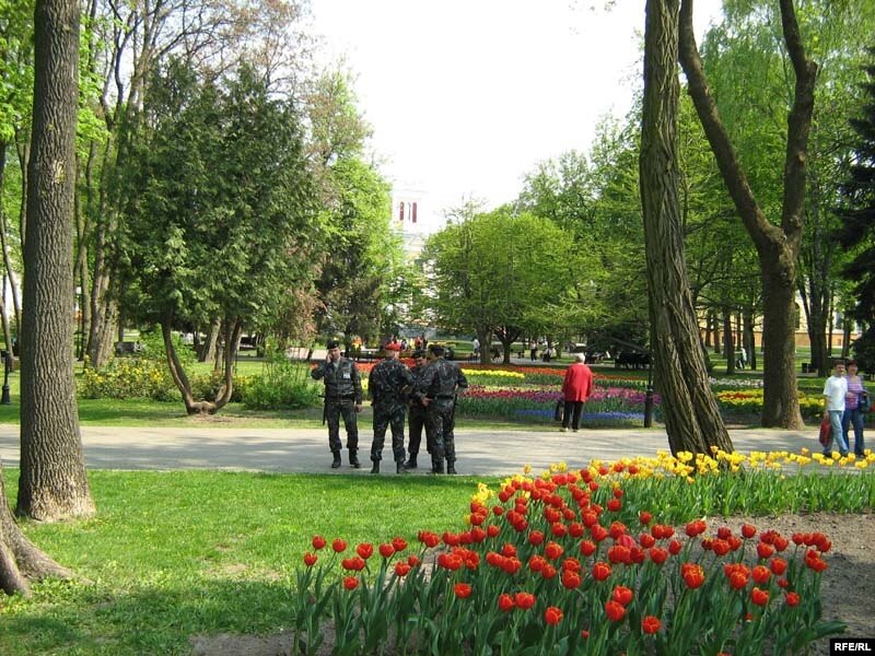 Вуліцы аздоблены чырвонымі сьцягамі – блізіцца ж таксама й Дзень перамогі.