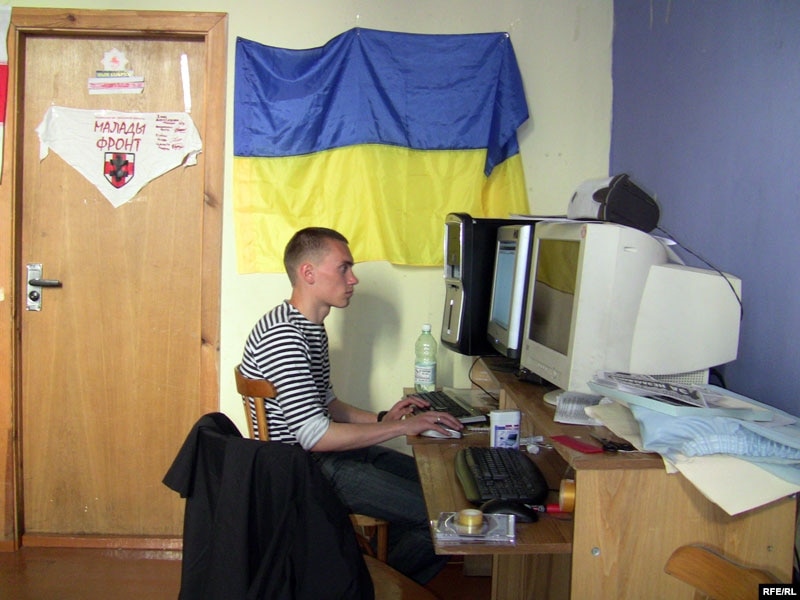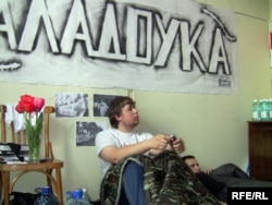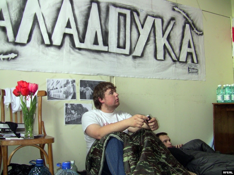 Шмат разоў быў у штаб-кватэры БНФ на прэсавых канфэрэнцыях і не заўважаў, што паміж заляй паседжаньняў і ўваходам ёсьць пакой з адным вакном. Тут і разьмясьціліся чацьвёра маладафронтаўцаў, якія абвесьцілі галадоўку салідарнасьці з Мікалаем Аўтуховічам, Юрыем Лявонавым і Ўладзімерам Асіпенкам. Уваходжу і адразу бачу на сьцяне вялікі плякат “ГАЛАДОЎКА”. Пад ім на расьсьцеленых на поле коўдрах сядзяць Наста Палажанка і Андрэй Кім, а бліжэй да мяне разьмясьціўся юнак, чые прозьвішча я не ведаў. Зьвяртаюся да яго.