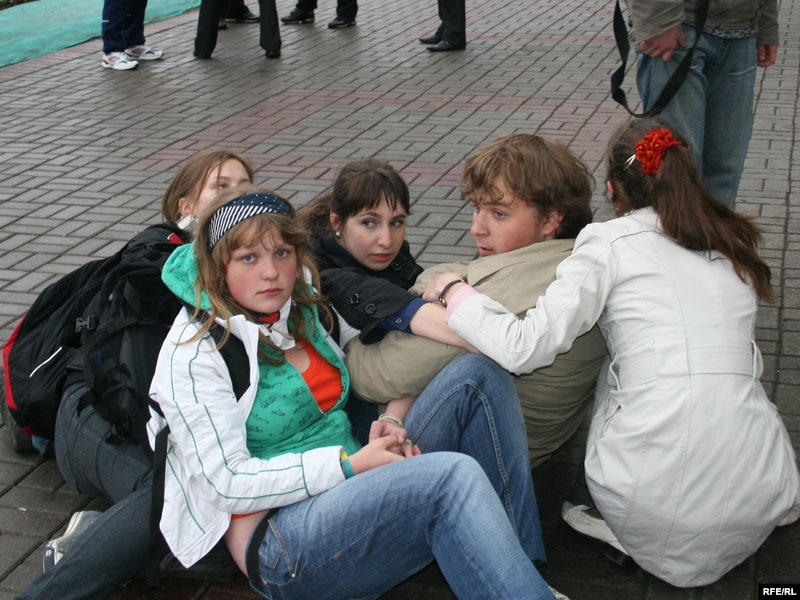 18:50 Сем спэцназаўцаў сталі ля Міколы Дземідзенкі. Ён сеў на ходнік. Яны сказалі, што маюць загад затрымаць яго. Тады да Міколы кінуліся пяць дзяўчын, ухапіліся за яго й разам селі на ходнік. Тады спэцназаўцы выклікалі падмогу. Цяпер іх 13 чалавек.