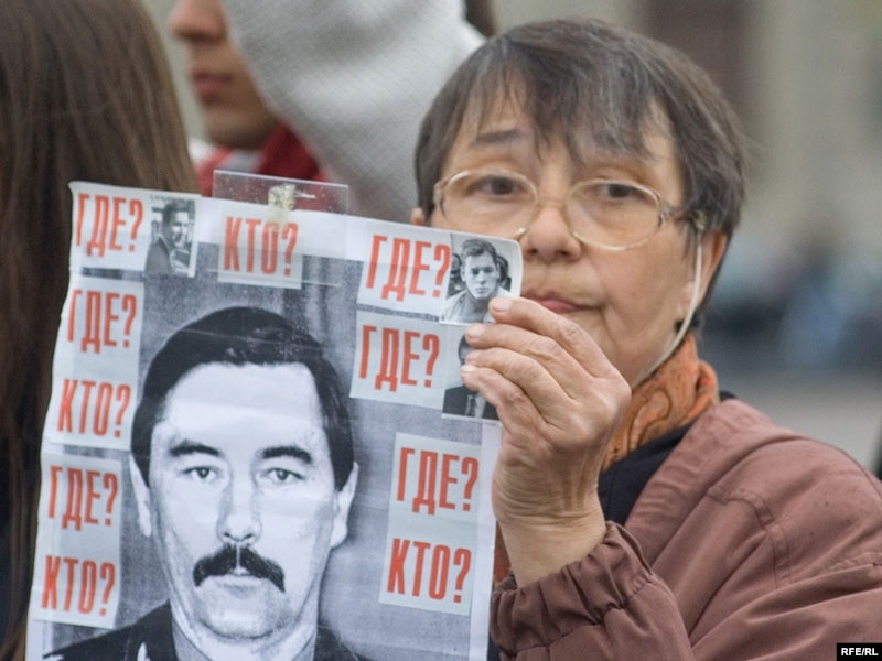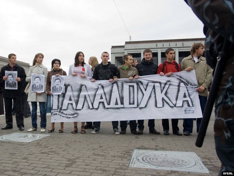 18:00 Каля 100 актывістаў сталі на Кастрычніцкай плошчы ў ланцуг з партрэтамі палітвязьняў і зьніклых.