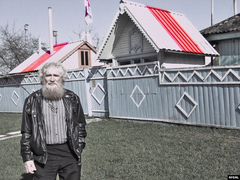 Я выходжу на аўтобусны прыпынак з хаты Сяргея Панамарова і яшчэ раз фатаграфую яго ля хаты, на фоне асобна ўзятага, відочнага, бел-чырвона-белага астраўка. Памятаеце, мінулая частка размовы скончылася тым, што вымушаны быў яго зьняць. Аж не — лунае ізноў. Спадар Сяргей працягвае:
