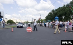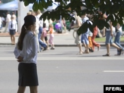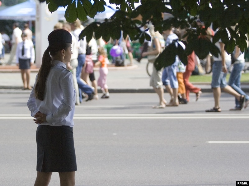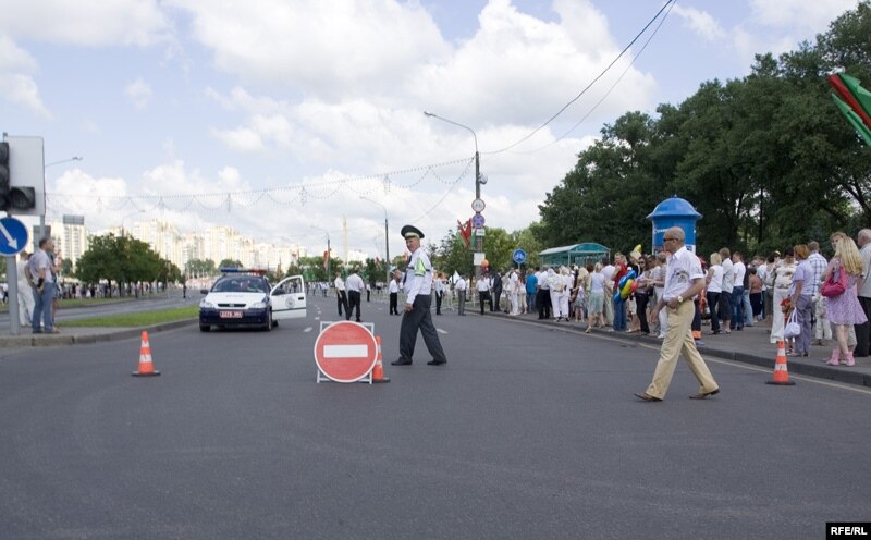 На час сьвяткаваньняў цэнтар гораду й масавыя месцы адпачынку ахоўваюцца шматлікімі міліцыянтамі й міліцыянткамі ў белых кашулях