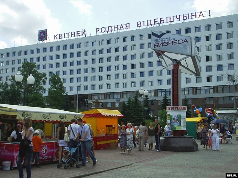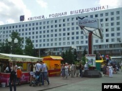 У цэнтры фэстывальнага Віцебску сёлета як ніколі шмат надпісаў па-беларуску: на доме нумар 28 па вуліцы Леніна — які быў вядомы ў горадзе як так званы “сіні дом”, але перад фэстывалем яго перафарбавалі ў белы колер — у прыцемках сьвеціцца надпіс “Славянскі базар” і ягоны сымбаль — валошка.