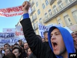 Пратэст украінскіх працаўнікоў казыно й заляў гульнявых аўтаматаў насупраць прэзыдэнцкай адміністрацыі ў Кіеве, 18 траўня 2009 году.