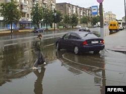 У цэнтры Віцебску сёньняшні моцны дождж пакінуў толькі глыбокія лужыны, аднак у жылых мікрараёнах, асабліва старых, пабудовы 50-70-х гадоў, утварыліся суцэльныя вадаёмы.