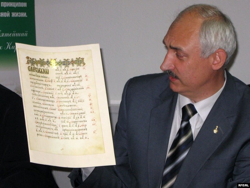 Да візыту Найсьвяцейшага патрыярха ўсяе Русі падрыхтавана факсымільнае выданьне Слуцкага Эвангельля.Яго паказвае Ўладзімер Грозаў, выканаўчы дырэктар Беларускага экзархату.