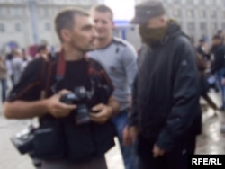Супрацоўнікі ў цывільным, адзін — з завязаным тварам — перашкаджаюць выконваць прафэсійныя абавязкі фотакарэспандэнту Reuters Васілю Фядосенку.
