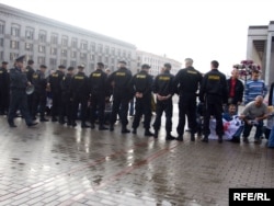 17:50 Перад пачаткам заплянаванай на 18-ю гадзіну акцыі па Кастрычніцкай плошчы езьдзіць вадавоз і палівае яе вадой. Плошча ўся залітая, але вадавоз працы не спыняе.
